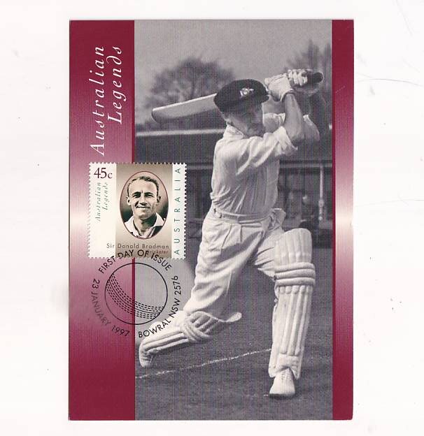 Zdjęcie przedstawia kartę pocztową Australia Post z 1997 roku, upamiętniającą australijską legendę krykieta, Sir Donalda Bradmana