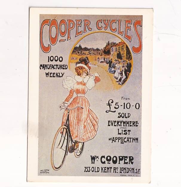 Reklama Cooper Cycles informuje o produkcji rowerów, ich cenie oraz danych kontaktowych producenta.