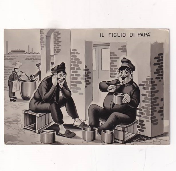 ilustracja przedstawia karykaturową scenę zatytułowaną „Il figlio di papà” (Syn tatusia), autorstwa Francisco Sancha y Lengo.