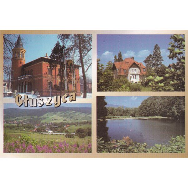 Pałacyk w stylu eklektycznym. Dom mieszkalny. Panorama Głuszycy na tle Gór Sowich. Jeden z pięciu stawów w Głuszycy.