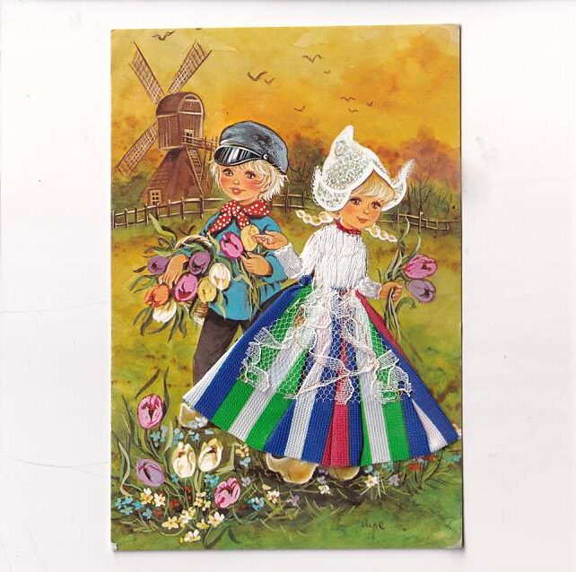 HISZPANIA DZIECI W STROJU LUDOWYM SABOTY WIATRAK POCZTÓWKA Z HAFTEM A23595