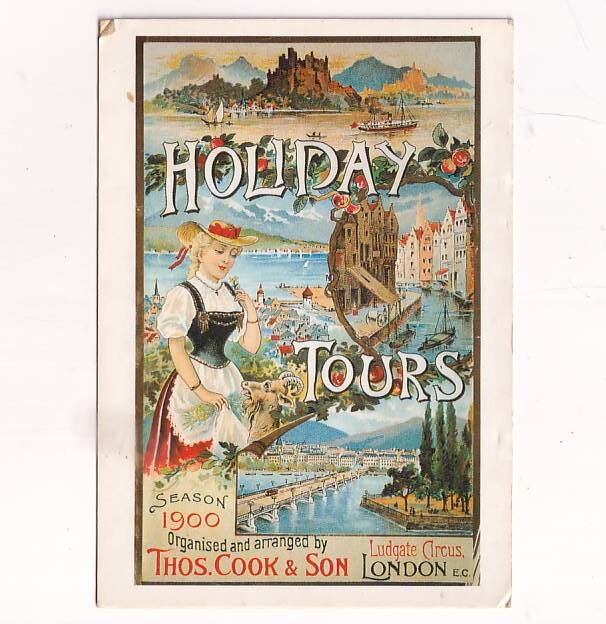 Obraz przedstawia plakat reklamowy biura podróży Thos. Cook & Son z 1900 roku, promujący wycieczki wakacyjne.