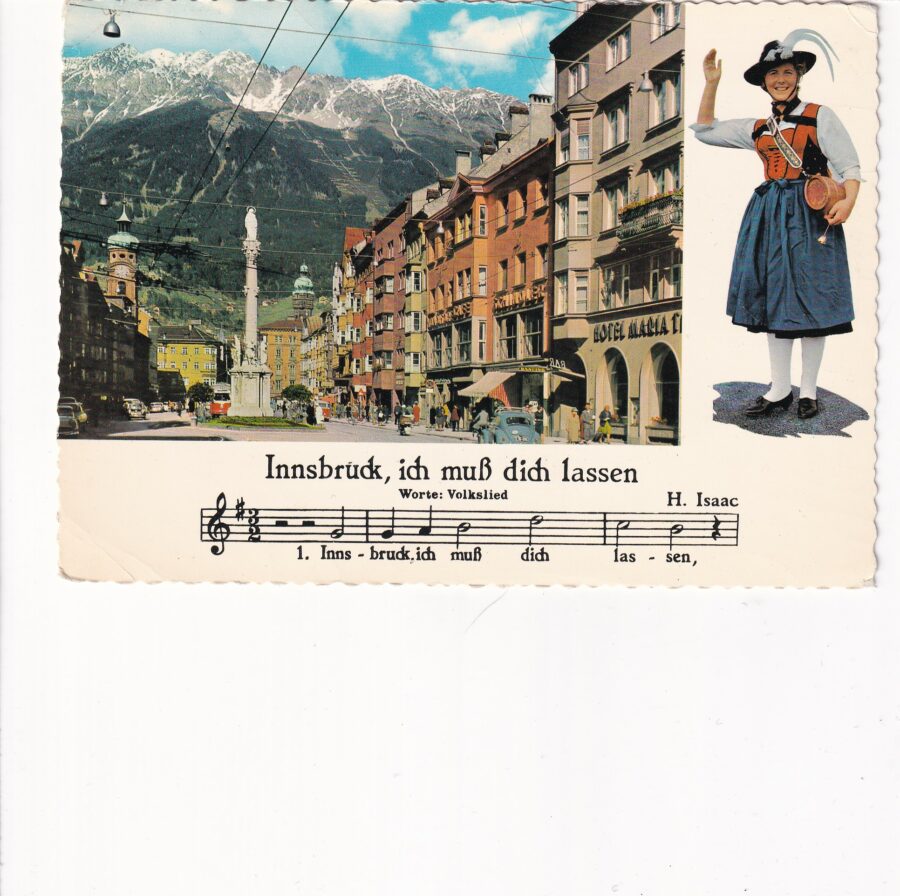 Pocztówka z INNSBRUCKU. Na zdjęciu ulica Marii Teresy.Strój ludowy oraz fragment zapisu nutowego piosenki.