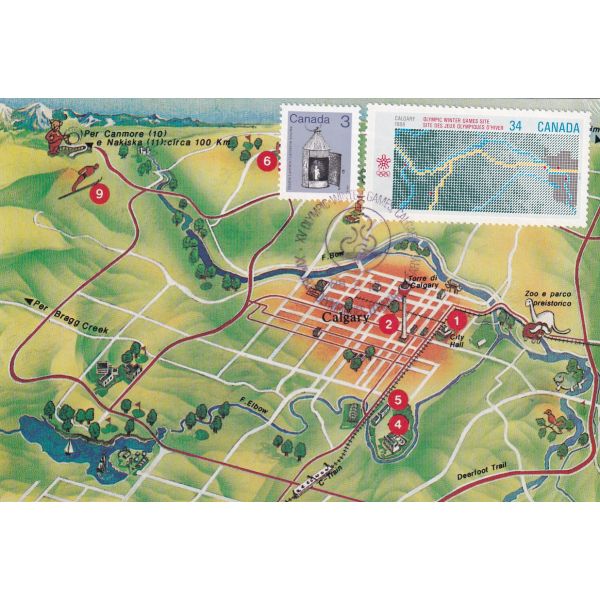 KANADA CALGARY 1988 ZIMOWE IGRZYSKA OLIMPIJSKIE MAPKA MAXIMUM ZNACZEK WIDOKÓWKA A72926