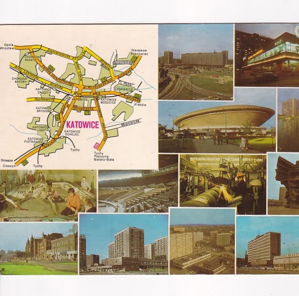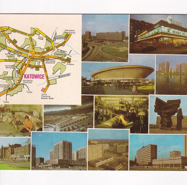 Prezentowany obraz to pocztówka wielokrotna (multiview) przedstawiająca miasto Katowice rok 1975
