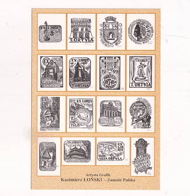 Obraz przedstawia zestaw czterech exlibrisów autorstwa Kazimierza Łońskiego z Zamościa, poświęconych Tadeuszowi Ortylowi z Sanoka.