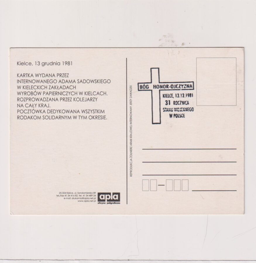 KIELCE 13 GRUDNIA 1981 SOLIDARNOŚĆ ADAM SADOWSKI POCZTÓWKA A3403