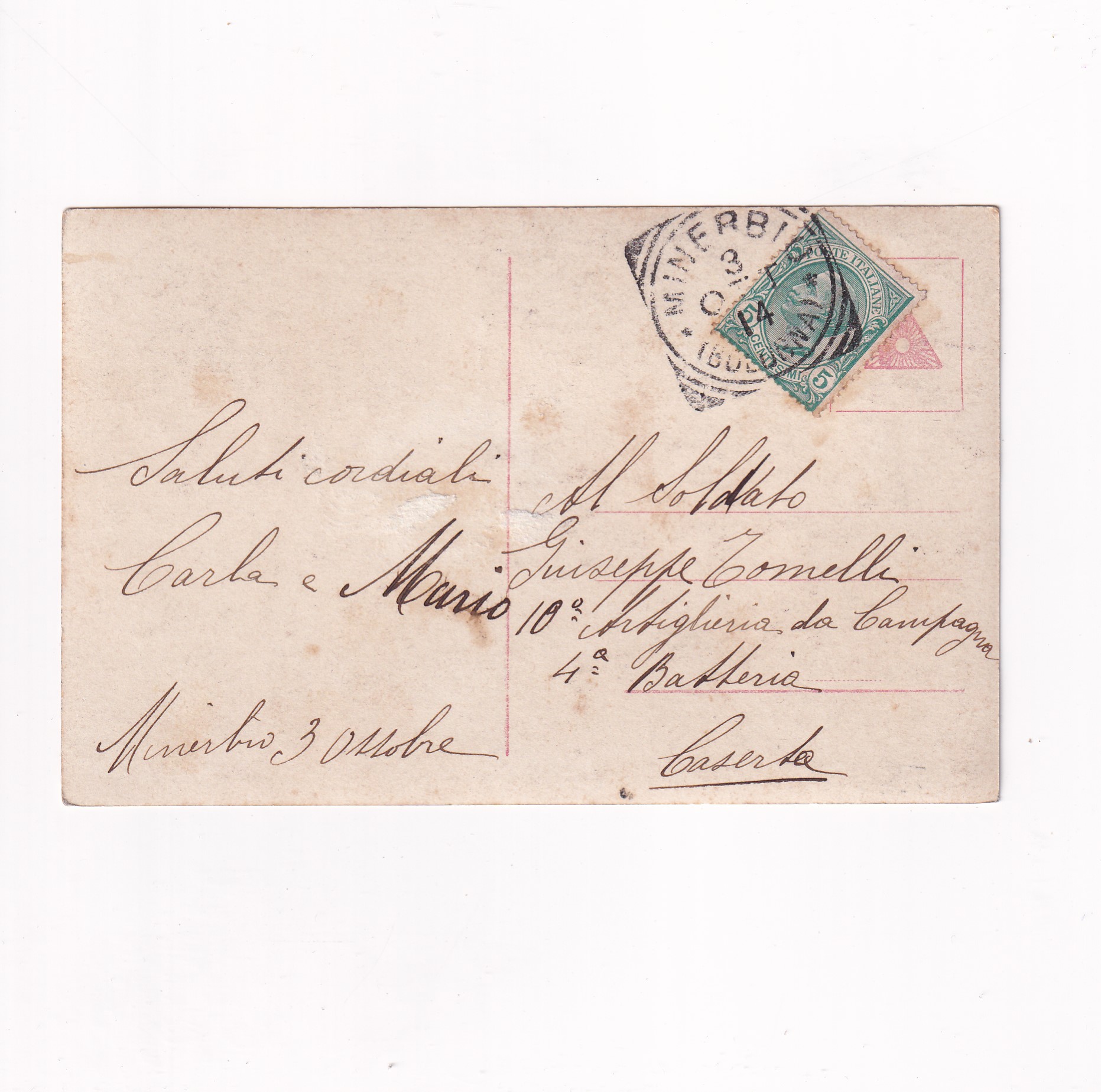 Stan jak na skanie, z obiegu . Pocztówka z Włoch. Rok nadania przed 1920. Znaczek i stempel.