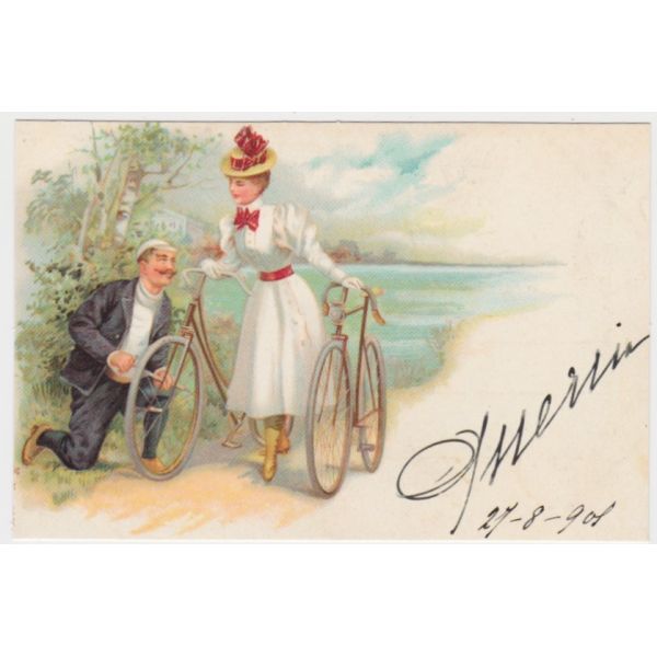 KOBIETA I MĘŻCZYZNA ROWERY POCZTÓWKA REPRINT A50773