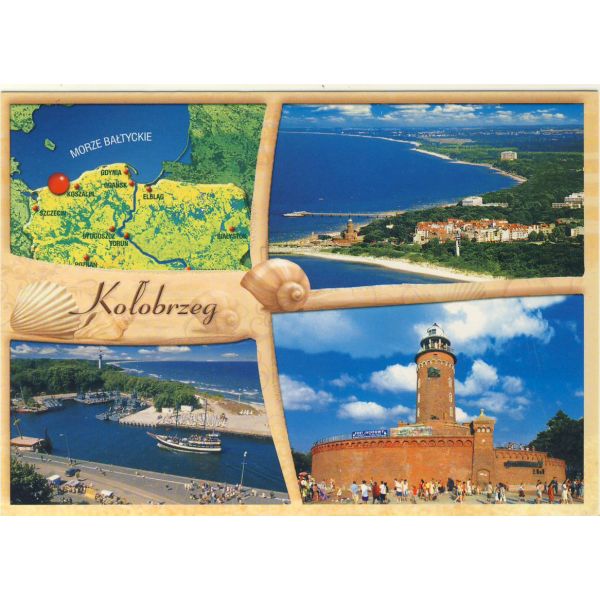 Widoki z Kołobrzegu, latarnia morska, mapka.