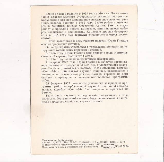 Jurij Nikołajewicz Głazkow w 1977 wziął udział w ostatnim locie do stacji orbitalnej Salut-5, która była ostatnią w ramach wojskowego programu Ałmaz.