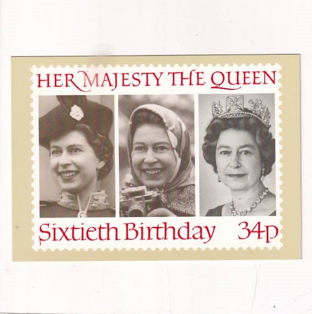 Pocztówka przygotowywana do karty maximum. Powstał taki sam znaczek z okazji 60-rocznicy urodzin królowej.