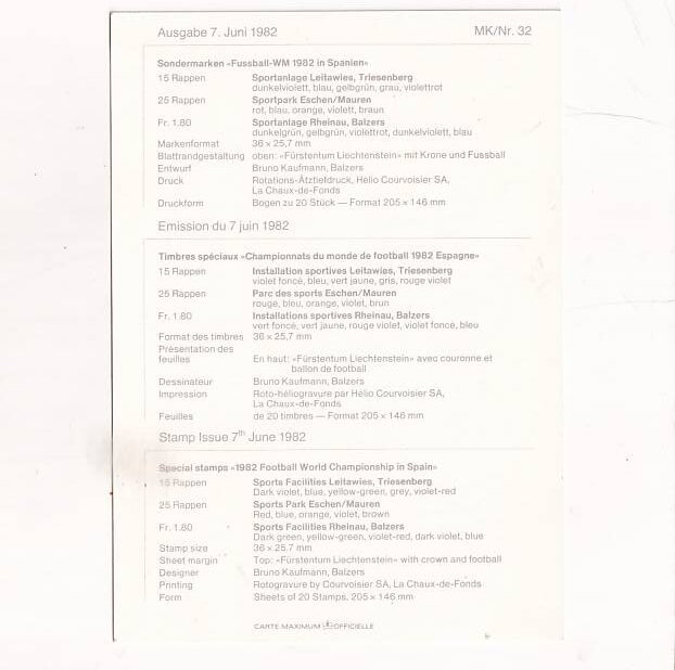 / LICHTENSTEIN FUTBOL WM 1982r BOISKO SPORT MAXIMUM POCZTÓWKA A33396