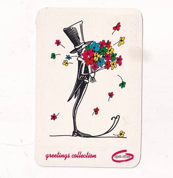 obraz przedstawia pocztówkę lub kartkę z humorem z serii „funny skier collection” z motywem mężczyzny z bukietem kwiatów.