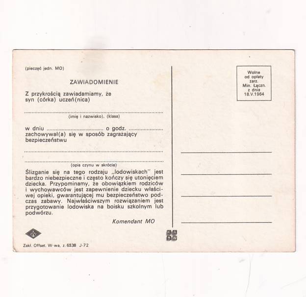 1964 r, Komendant MO zawiadamia rodziców o naruszeniu przez ich dziecko przepisów ruchu drogowego i bezpieczeństwa.