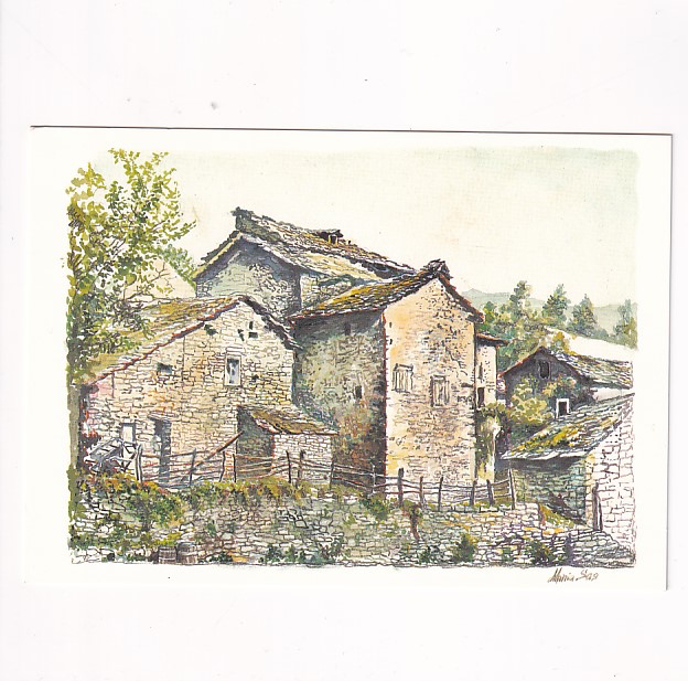 grafika przedstawia szkic akwarelowy tradycyjnych kamiennych domów z kamiennymi dachami, charakterystycznych dla architektury wernakularnej określonych regionów górskich,  we Włoszech