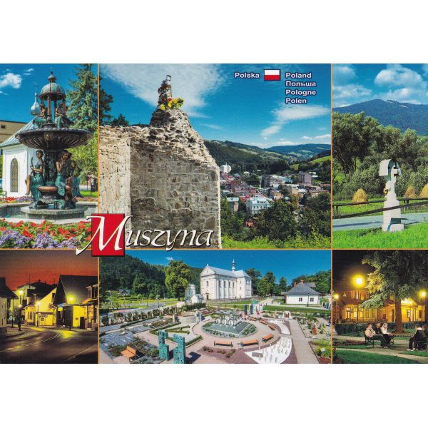Fontanna na muszyńskim rynku. Ruiny Zamku Biskupiego z 1301 r. Krzyż przydrożny zJaworzyną Krynicką w tle. Ulica Kościelna nocą. Ogrody Biblijne i kościół pw. św. Józefa. Planty na Rynku nocą.