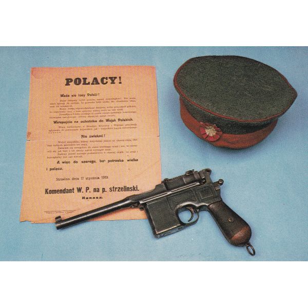 Odezwa wzywająca do stawania w szeregach Wojsk Wielkopolskich, pruska furażerka z polską kokardą powstańczą i 7,63 mm pistolet syst. Mausera wz. 1896 użyty w Powstaniu Wielkopolskim 1918-1919 r,