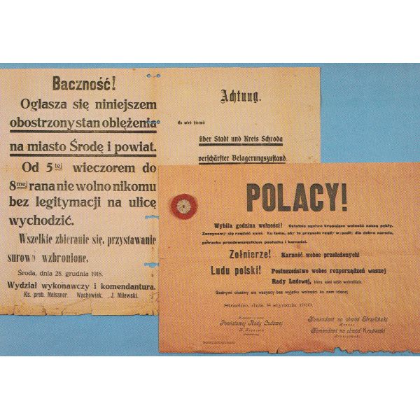 Dwie odezwy wydane po wybuchu Powstania Wielkopolskiego 1918-1919 r. – ze Środy i Strzelna; pośrodku- kokarda powstańcza z czapki.