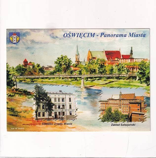 OŚWIĘCIM PANORAMA MIASTA HERB AKWARELA POCZTÓWKA A29450