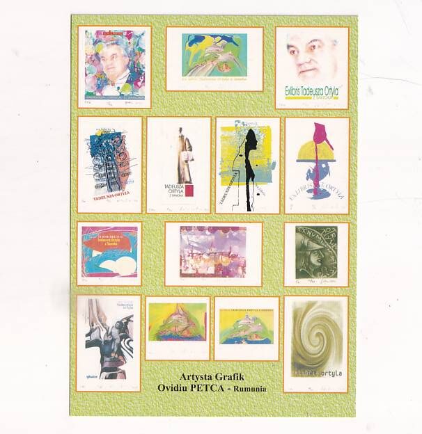 Obraz przedstawia zestaw czterech exlibrisów autorstwa Ovidiu Petca z Rumunii, poświęconych Tadeuszowi Ortylowi z Sanoka.