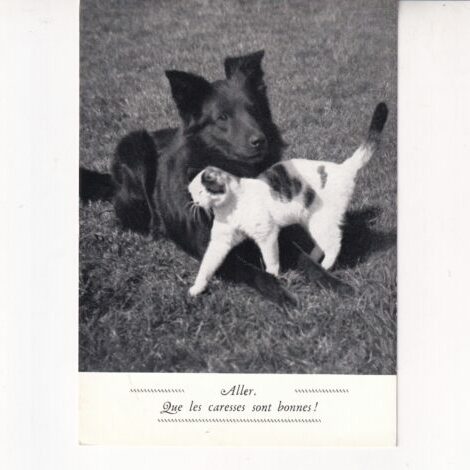 Pocztówka włoska. Kolor : czarno-biała. Pies z kotem.