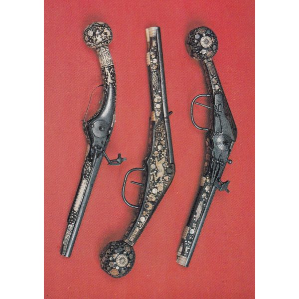 Pistolety – „puffery” z zamkami kołowymi, Eurpoa Środkowa, 2 poł. XVI w., żelazo, drewno orzechowe, kość, masa perłowa, rytowanie, inkrustacja