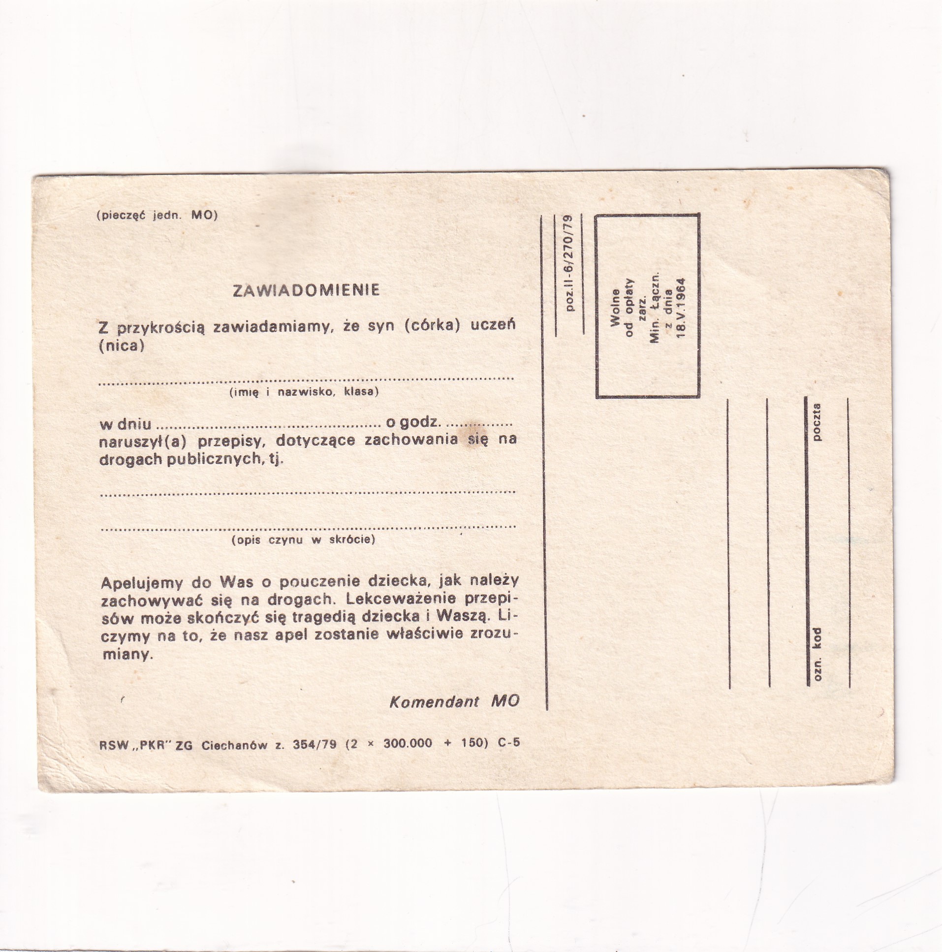 Forma „mandatu” /”zawiadomienia” dla rodziców za wykroczenie ich dziecka.