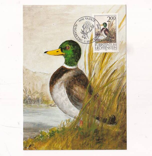 Na zdjęciu znajduje się pocztówka przedstawiająca z wizerunkiem kaczki krzyżówki (Mallard)