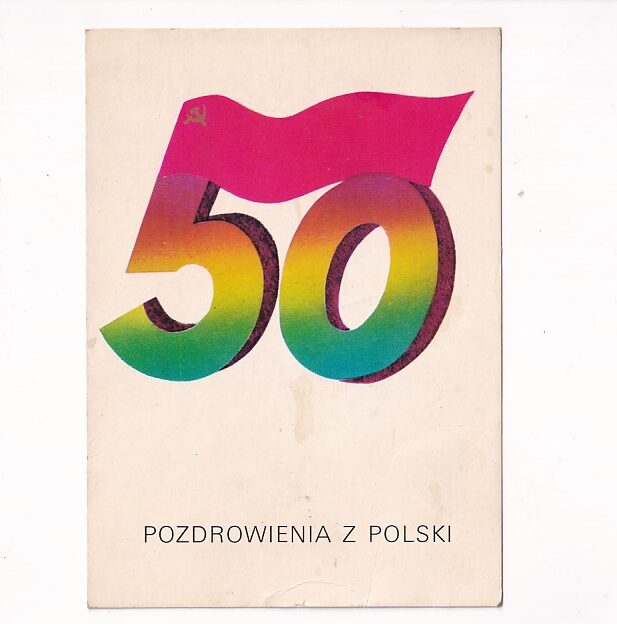 Kartka upamiętniająca 50-lecie (prawdopodobnie powstania PRL lub innej organizacji socjalistycznej), o czym świadczy symbol sierpa i młota na fladze.