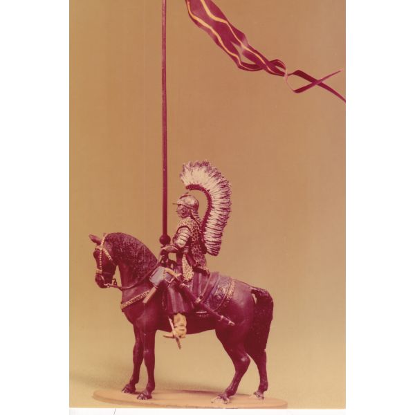 Husarz polski, w półzbroi płytowej na żupanie, ze skrzydłami i skórą lamparcią, w szyszaku; kopia z proporcem, szabla husarska, pistolety w olstrach, rząd polski, z czasów Odsieczy Wiedeńskiej, r. 1683.