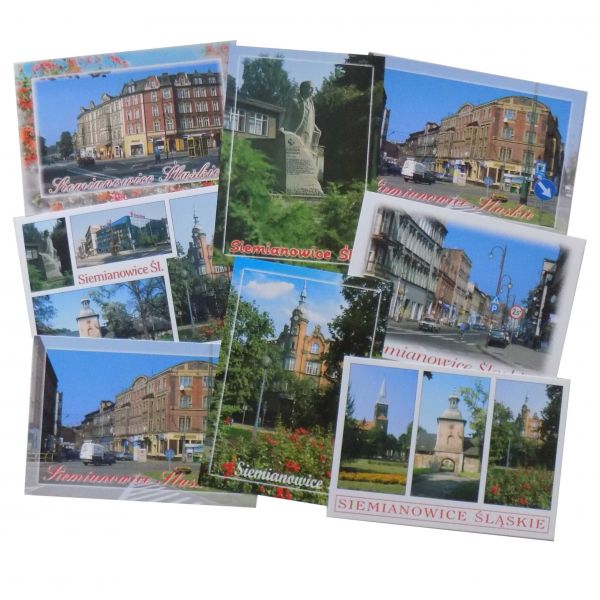 Kolekcja 8 pocztówek z widokami z Siemianowic Śląskich, wydanych na przestrzeni ostatnich kilku lat.