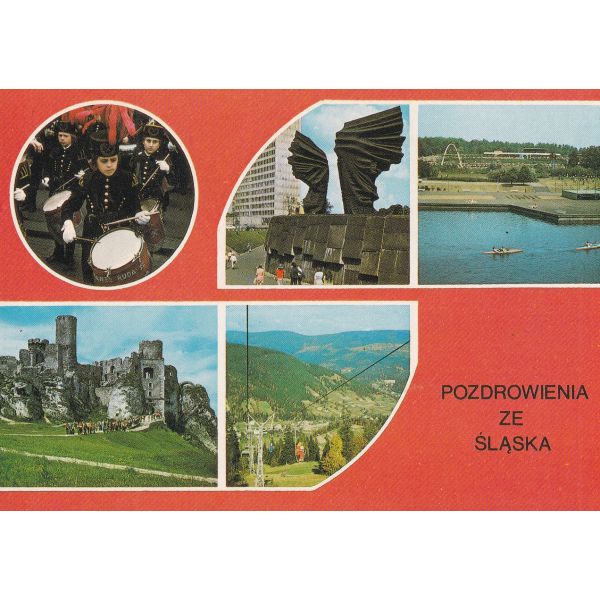 Orkiestra Kopalni „Walenty-Wawel” z Rudy Śląskiej. Pomnik Powstańców Śląskich w Katowicach. Wojewódzki Park Kultury i Wypoczynku. Ruiny XVI-wiecznego zamku w Ogrodzieńcu. Krajobraz Beskidu Śląskiego.