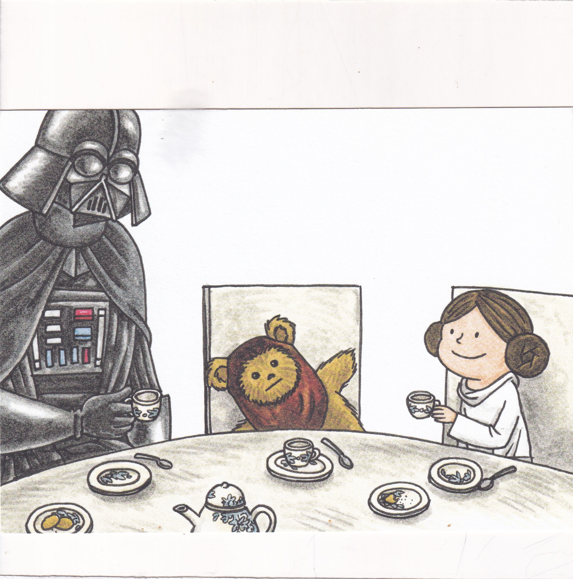 Pocztówka z ilustracjami pochodzącymi z książki „Vader i córeczka” autorstwa Jeffreya Browna.