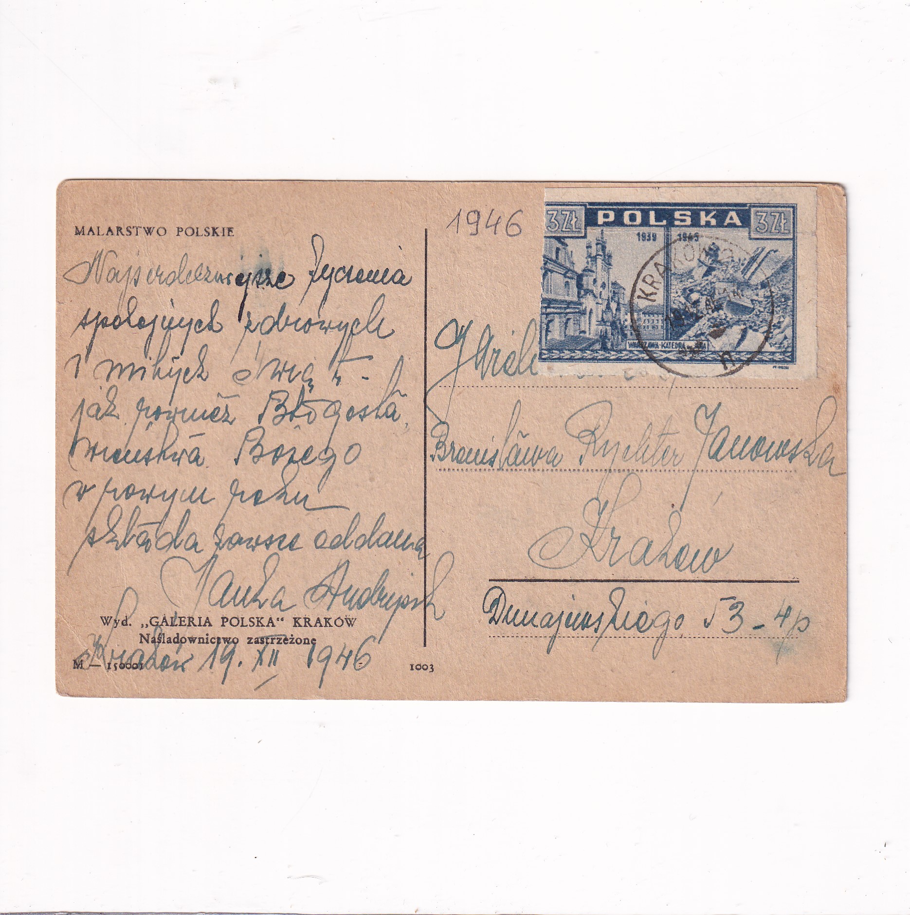 Stan jak na skanie, z obiegu. Znaczek i stempel. Wysłano w roku 1946