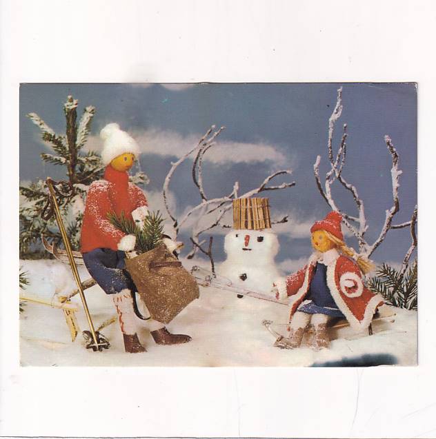 WESOŁYCH ŚWIĄT LALKI SANECZKI NARTY BAŁWANEK POCZTÓWKA A28314