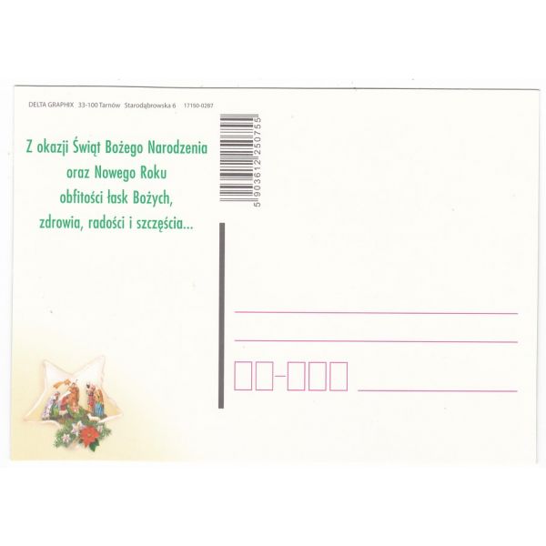 Kolorowa pocztówka świąteczna ze zdobieniem brokatowym, z tyłu życzenia.