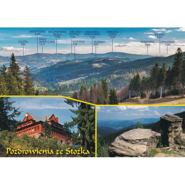 Panorama Beskidu Śląskiego i Żywieckiego. Schronisko na Stożku. Skały na Krykawicy.