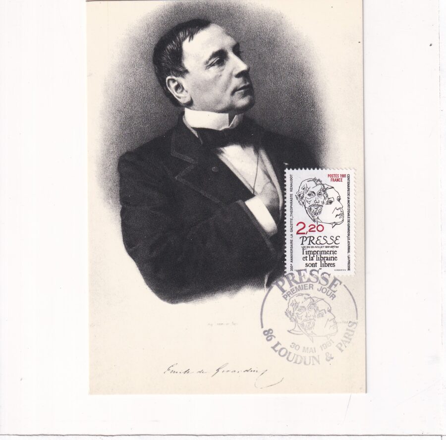 Émile de Girardin (22 czerwca 1802 – 27 kwietnia 1881) był francuskim dziennikarzem, wydawcą i politykiem. Był najbardziej utytułowanym i najbardziej ekstrawaganckim francuskim dziennikarzem epoki, prezentując się jako promotor masowej edukacji poprzez masowe dziennikarstwo. Jego magazyny dotarły do ponad stu tysięcy subskrybentów, a jego niedrogi dziennik La Presse wyprzedził konkurencję o połowę, dzięki tańszej produkcji i cięższej reklamie.- za wikipedią