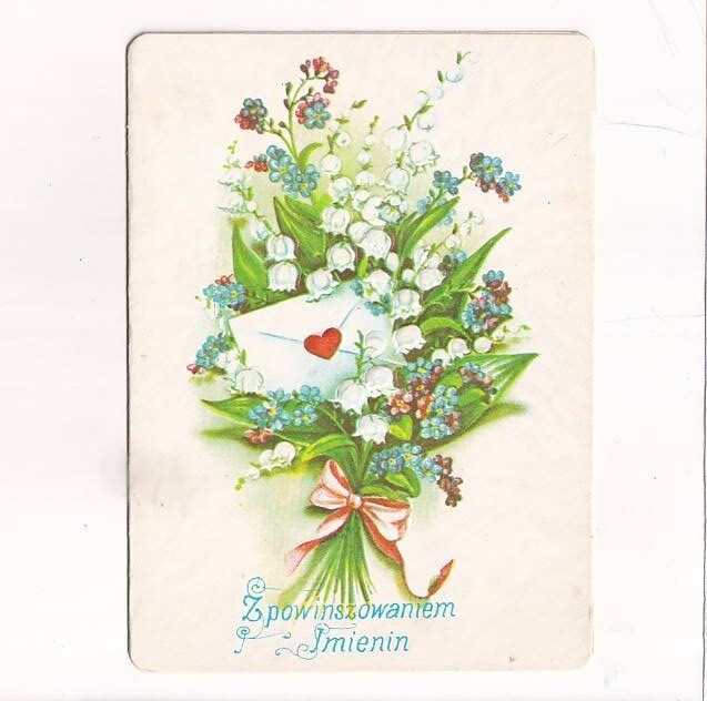 Z POWINSZOWANIEM IMIENIN BUKIET KONWALII NIEZAPOMINAJKI ŻYCZENIA KARNET POCZTÓWKA A28498