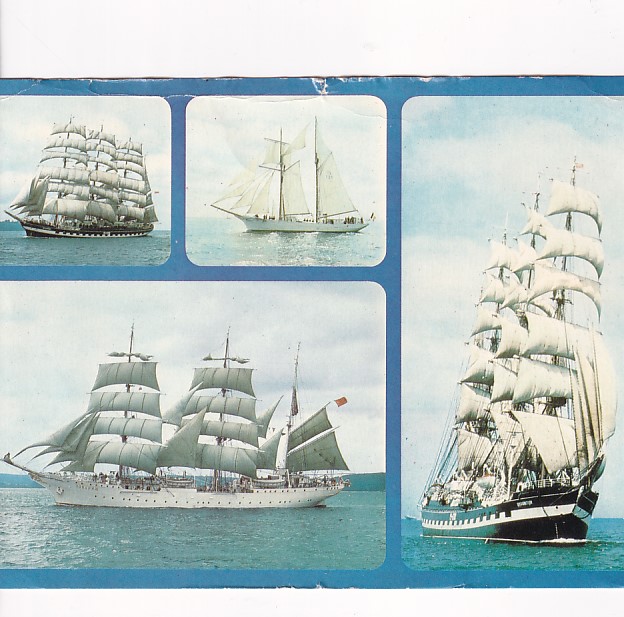 Pocztówka przedstawia żaglowiec Towariszcz,Kruzensztern – ZSRR oraz La belle Poule – Francja