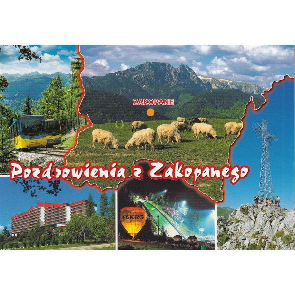 Giewont i owce na Antałówce. Wagoniki kolejki na Gubałówkę. Hotel Mercure Kasprowy. Skocznia narciarska. Krzyż na Giewoncie.