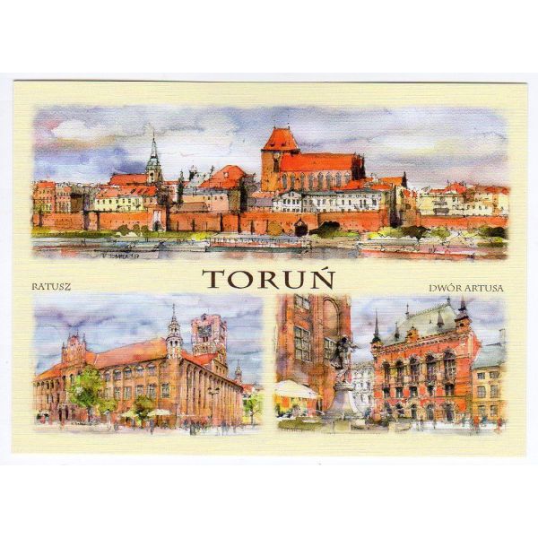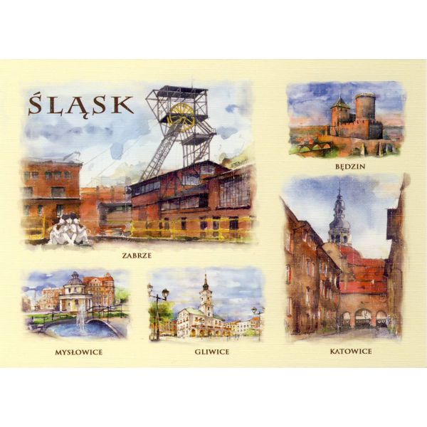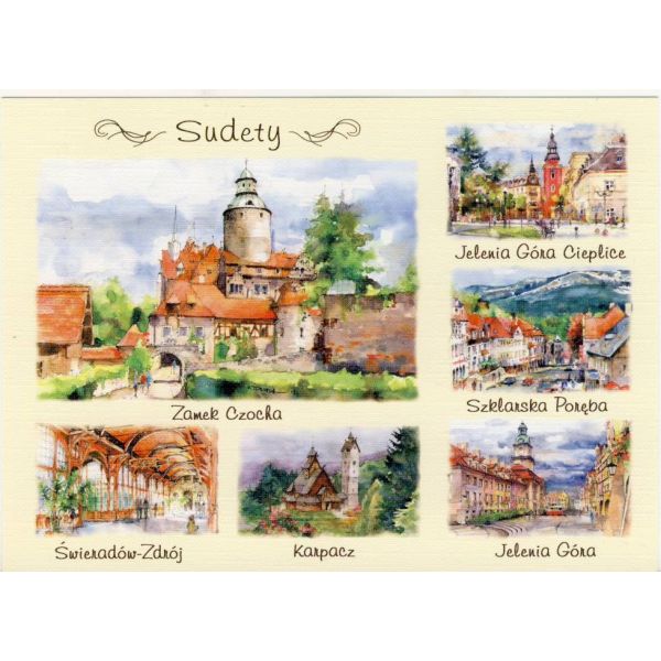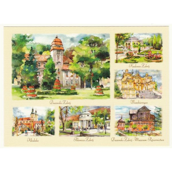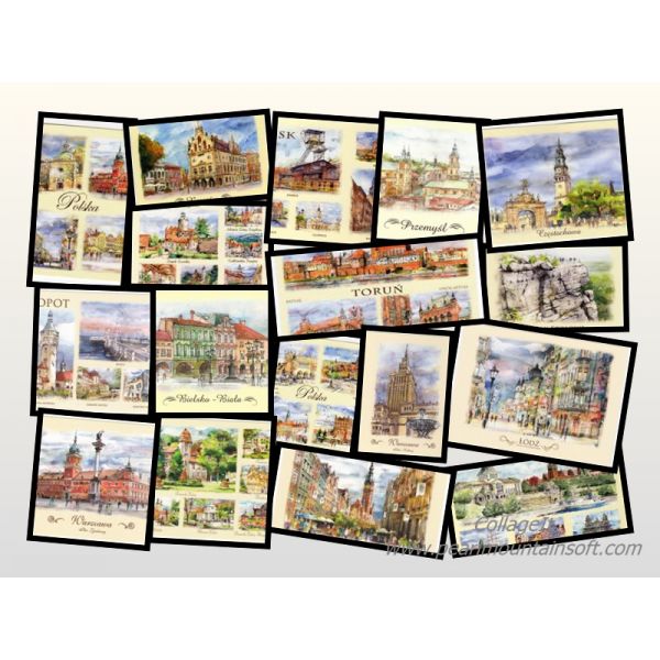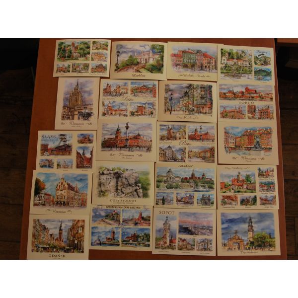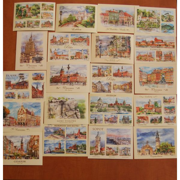 Kolekcja 20 widokówek przedstawiających miasta i regiony Polski w akwareli.