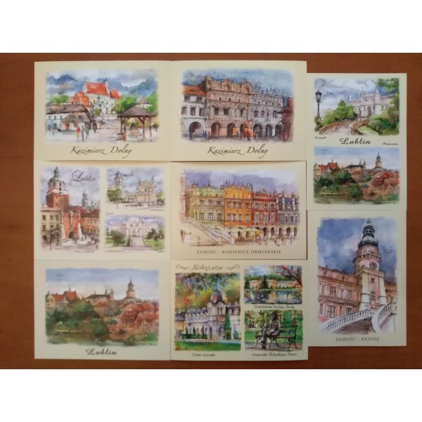 Na widokówkach między innymi: KAZIMIERZ DOLNY, ZAMOŚĆ, LUBLIN, NAŁĘCZÓW.